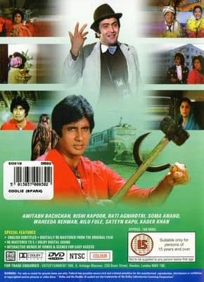 Remembered mainly as the film in which Bachchan suffered a near-fatal accident. The frame, recording the incident, is frozen as the legend of his injury flashes on to the screen. It is also Manmohan Desai's most aggressively communal film. Iqbal (Bachchan) is orphaned when the villain Zafar (Khan) kills his father and rapes his mother Salma (Rehman). Zafar also bursts a dam killing hundreds of people. Iqbal grows up to become a leader of the coolies (porters) at a railway station. Other characters are the drunken journalist Sunny (Kapoor), a foster-child of the villain who befriends Iqbal, and the rich heroine Julie (Agnihotri) whose father was also killed by the villain. The end of the film, shot at the Haji Ali mosque in Bombay, makes an appeal to the lumpenised Muslim underclass when an injured Iqbal invokes the power of Allah to deal the death blow to the villain. Iqbal also enjoys an electoral triumph over Zafar, foreshadowing Bachchan's election as an MP in 1984